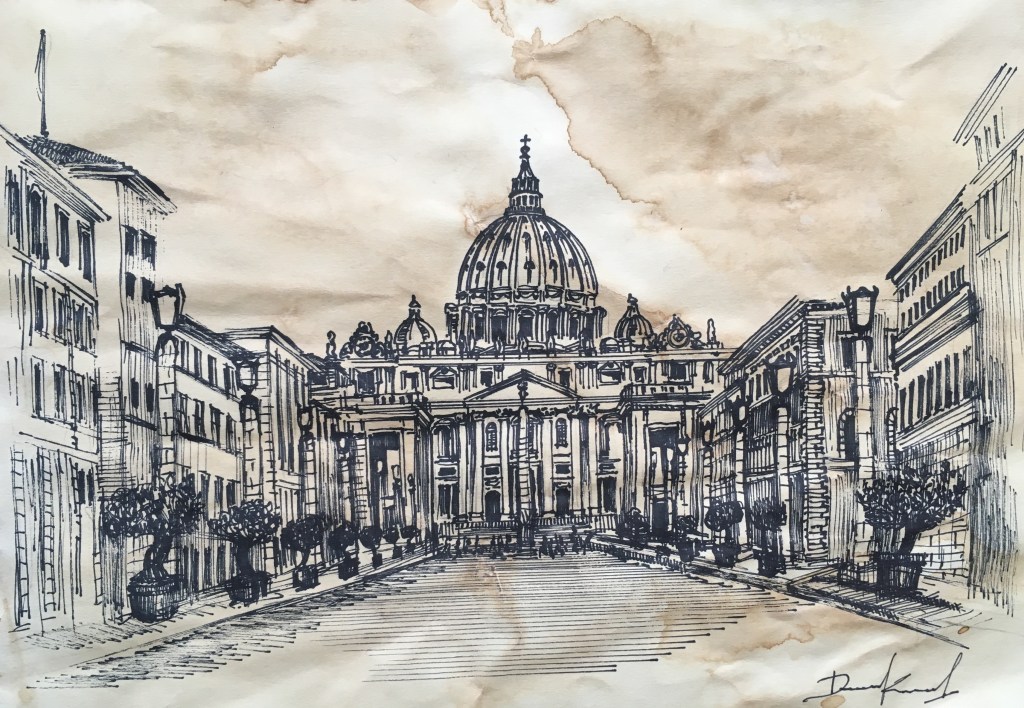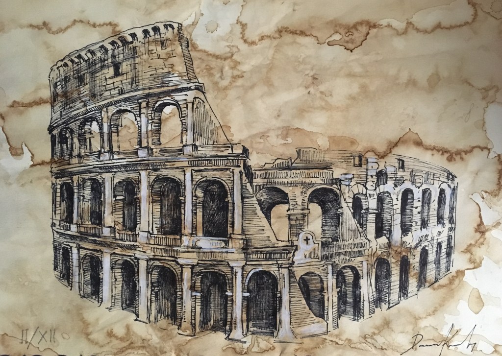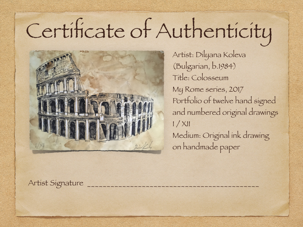 Авторски рисунки върху състарена хартия, посветени на известни паметници на архитектурата в Рим. Всяка рисунка е подписана, номерирана и придружена от сертификат за автентичност.