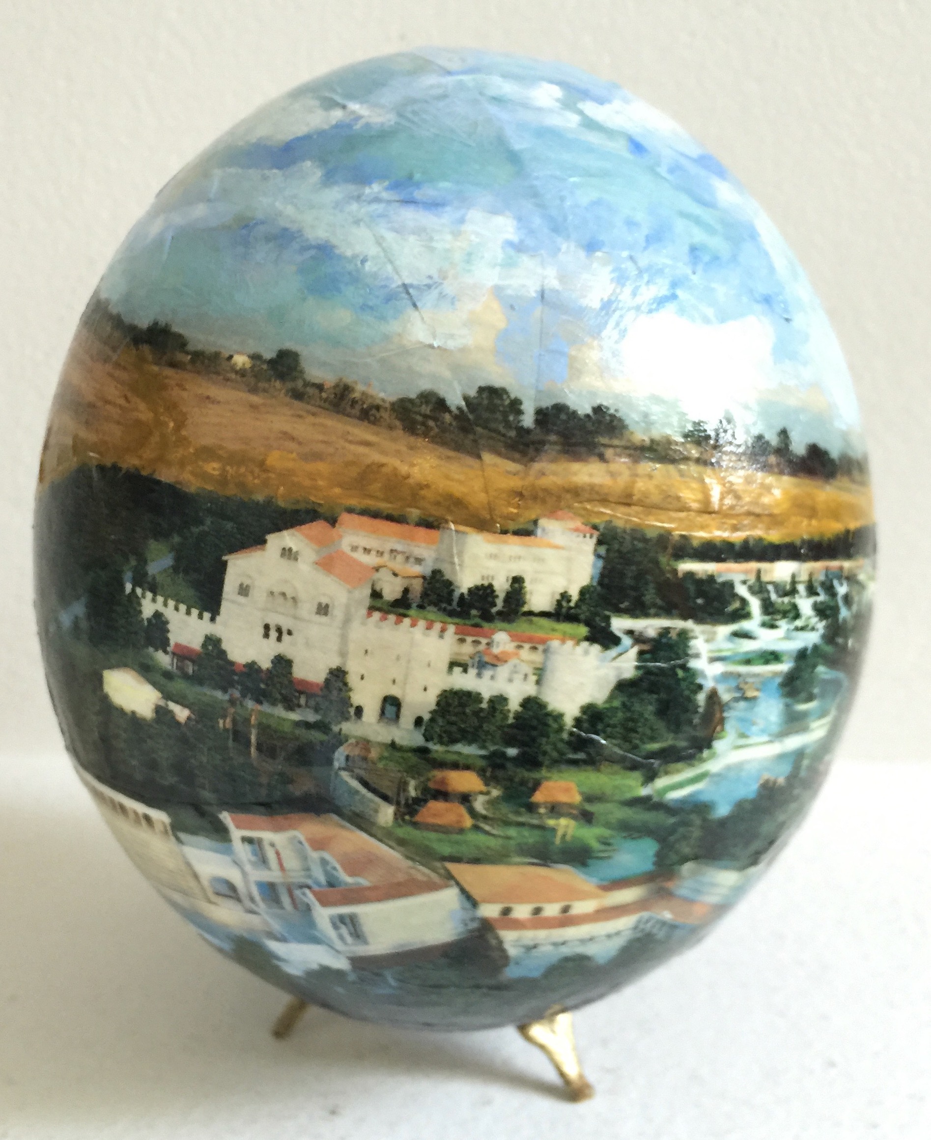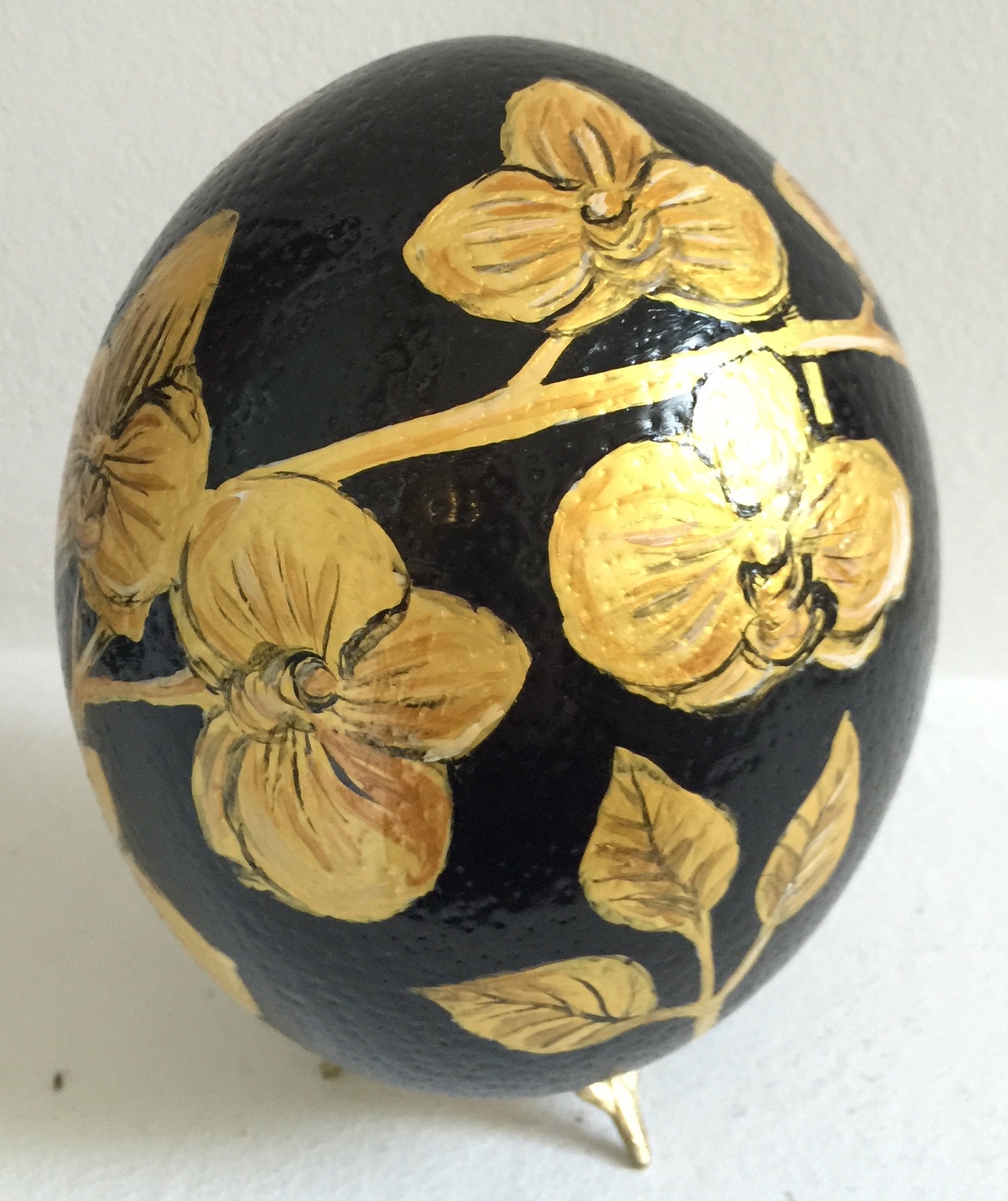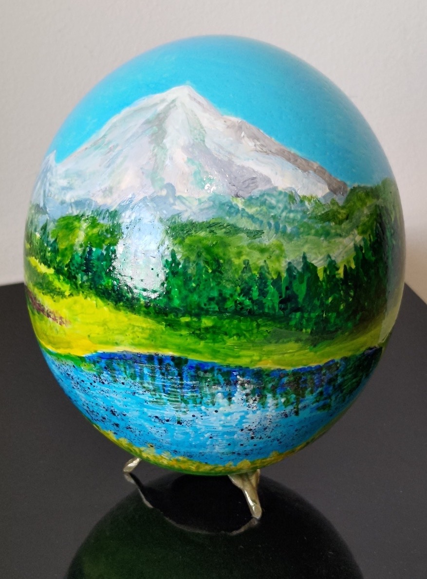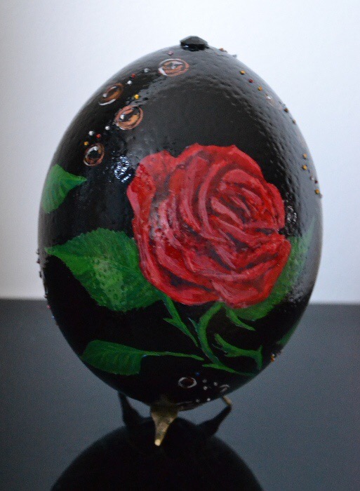 Щраусовото яйце има цвят на слонова кост и твърда, грапава повърхност. Поради своята здравина, черупката му може да бъде красиво гравирана или да се рисува свободно върху нея. Вдъхновена от тези предимства и символика, реших да създам “овални” картини. Всяка черупка е предварително изпразнена от съдържание и добре почистена отвътре и отвън преди процеса на рисуване. Отворът запечатвам със специална смола. В долната част на яйцето прикрепям малка месингова стойка с три извити крачета за ефектен завършек.